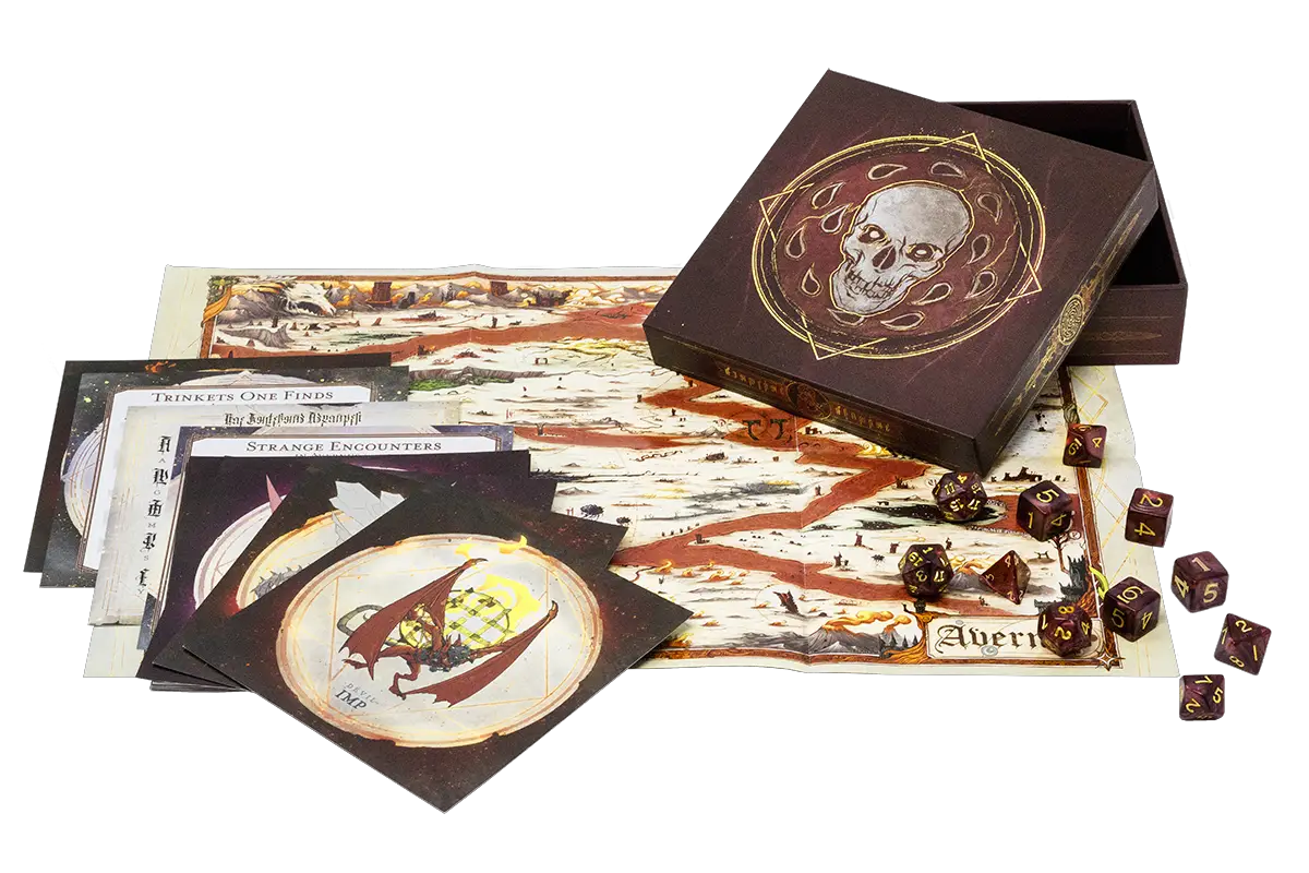 From the streets of Baldur’s Gate to the front lines of the Blood War, the dice you cast might be your last. The Dice & Miscellany set includes 11 dice, a dice tray/box, 20 double-sided cards with exclusive content, a foldout map of Avernus, and even a sizing chart for the demons and devils of the Blood War!