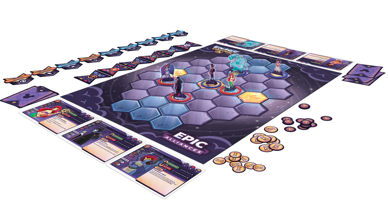 “Gaston acts as a go-to brawler with brawn, while Aladdin is great at evading attacks! Players recruit different characters and harness their skills to make the smartest moves and attacks to earn Victory Points. While strategizing their way to victory, fans will enjoy the rich character art and stylized design elements built into Epic Alliances’ tabletop components, as seen in the character standees down to the Battle Cards and various effect details.”