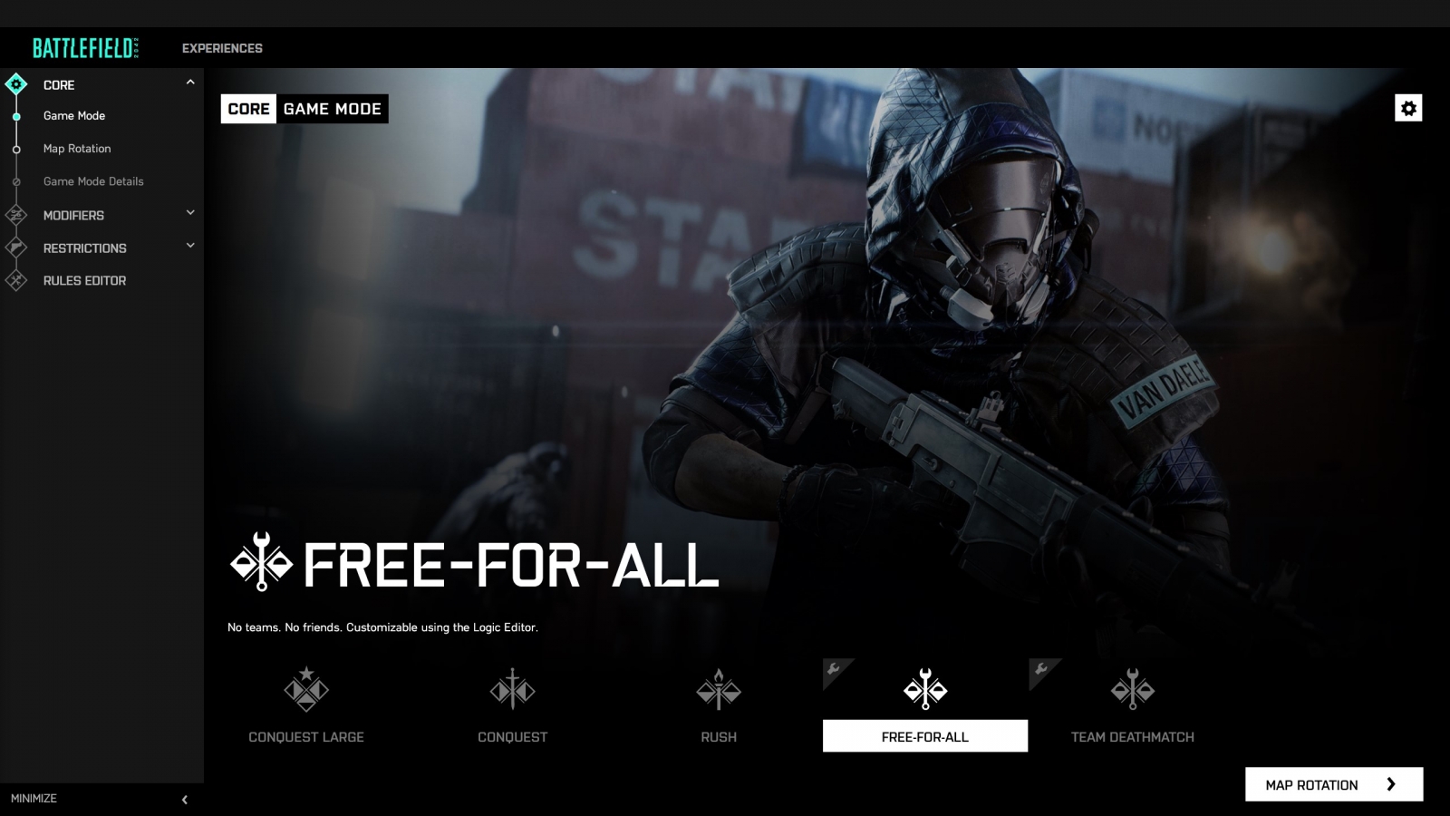 Team DeathmatchConquest Large, Conquest, and Rush can each be customized/tweaked using all of our inbuilt modifiers and toggles that you’ll learn about shortly. Free-For-All and Team Deathmatch are adjustable with the same tools, but can also be further built upon with the Rules Editor, our powerful visual programming tool that allows you to visually code something truly unique.