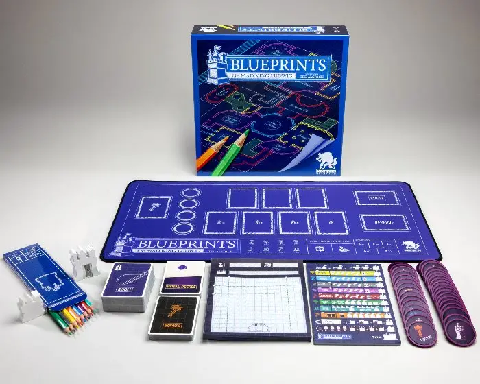 Sharpen your pencils as Bezier Games proudly presents Blueprints of Mad King Ludwig! Test your architectural design skills in this flip & sketch strategy game from designer Ted Alspach to draw the most extravagant blueprints for King Ludwig’s next castle, launching on Kickstarter February 7th! Featuring premium vellum paper, a custom neoprene play mat, full-size color pencils, GameTrayz™ organizers and more!
