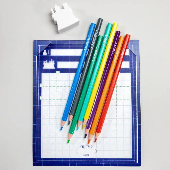 Pledge for the upgraded deluxe Kickstarter version featuring 5 sets of full-size colored pencils (one set of 8 pencils per player), 2 sketch pads, 2 score pads, a custom wooden castle-shaped pencil sharpener, and ginormous 12” x 24” stitched neoprene play mat that fits rolled-up inside the game box! You can also upgrade to fancy poker chip style favors!