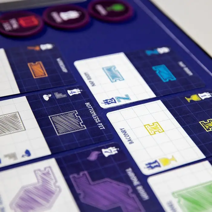 Select rooms from the market to draw in your castle’s floor plan. As you complete rooms’ entrances by connecting them to other rooms, earn new abilities such as adding or removing entrances, earning bonus cards, or even adding a moat!
