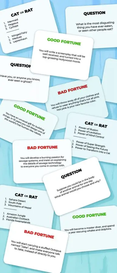 Featuring charming and colorful art, each set provides three decks of cards, each with their own specific roles. Draw new cards and take turns to ask each other questions using prompts designed for inclusivity and relaxation. Fortune cards supply the framework and goal for each playthrough, while Cat or Rat cards add cues for players to interact, making choices that reveal more about them and providing a spark for conversation.