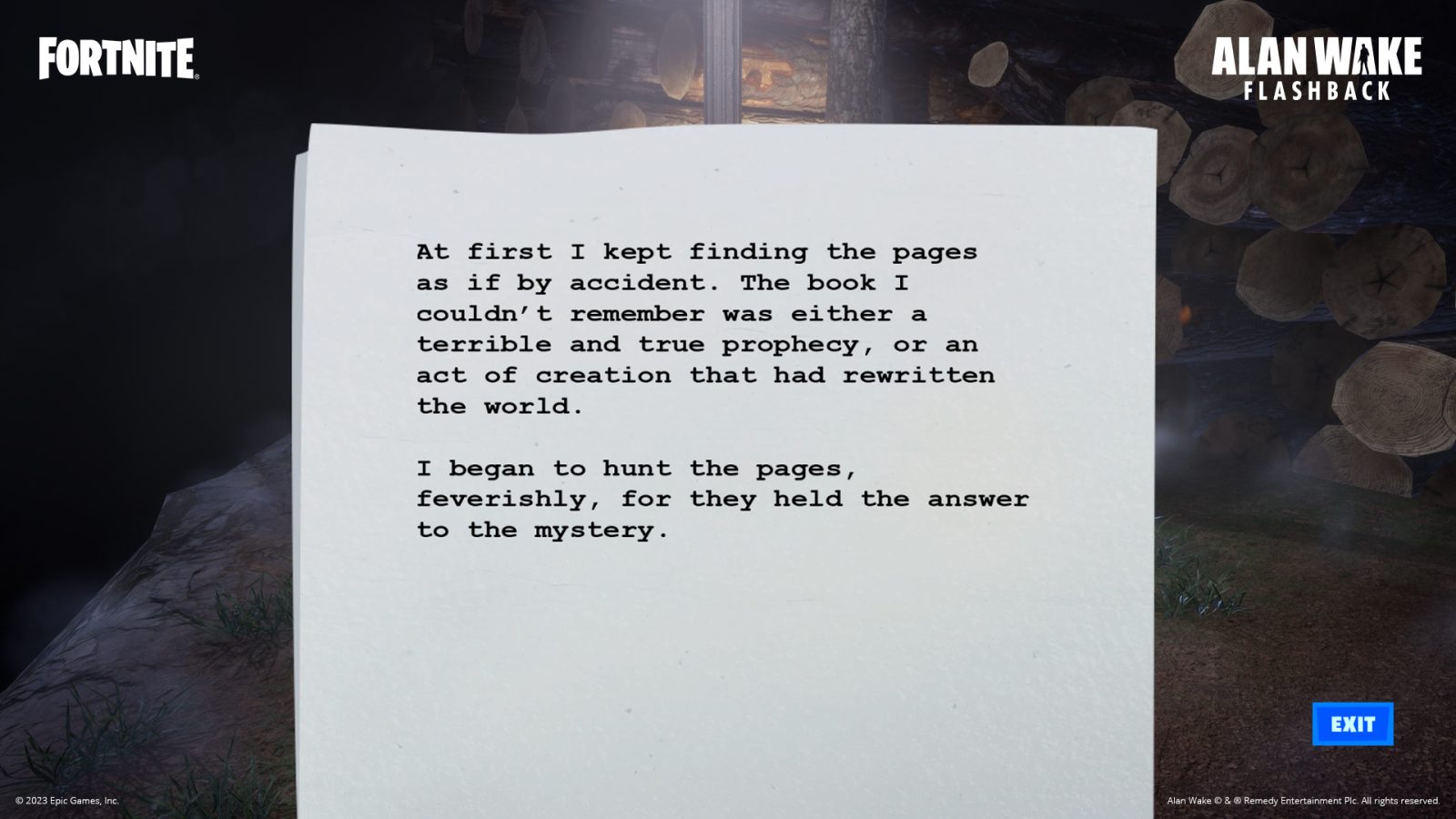 Based on the award-winning cinematic action-thriller, Alan Wake: Flashback reimagines Remedy Entertainment’s iconic story in Fortnite. Troubled author Alan Wake embarks on a desperate search for his missing wife, Alice. Following her mysterious disappearance from the Pacific Northwest town of Bright Falls, he discovers pages of a horror story he has supposedly written, but has no memory of.