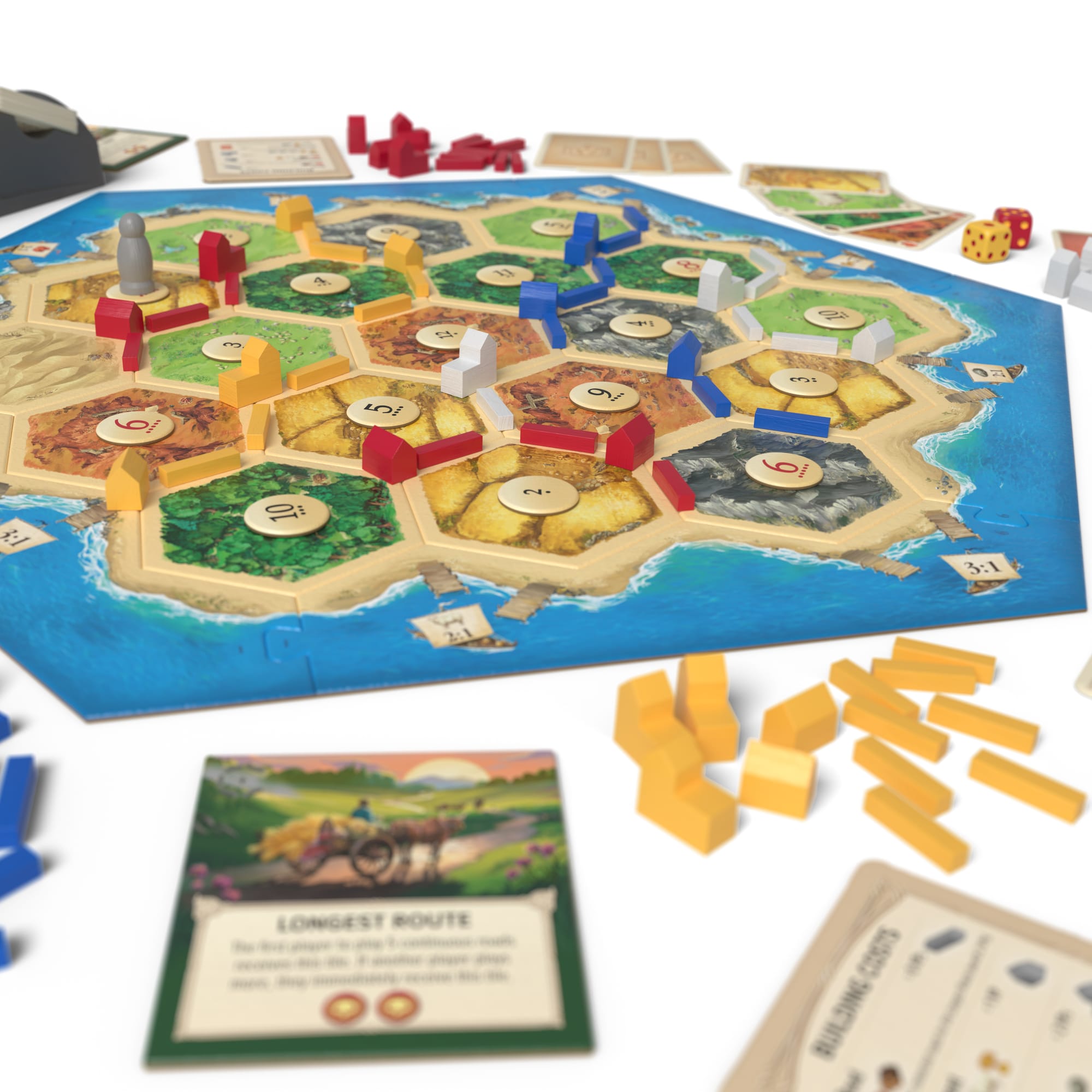 - A New Look – Featuring more modernized and brighter artwork, the updated game components and packaging immerse players in the world of Catan like never before.
