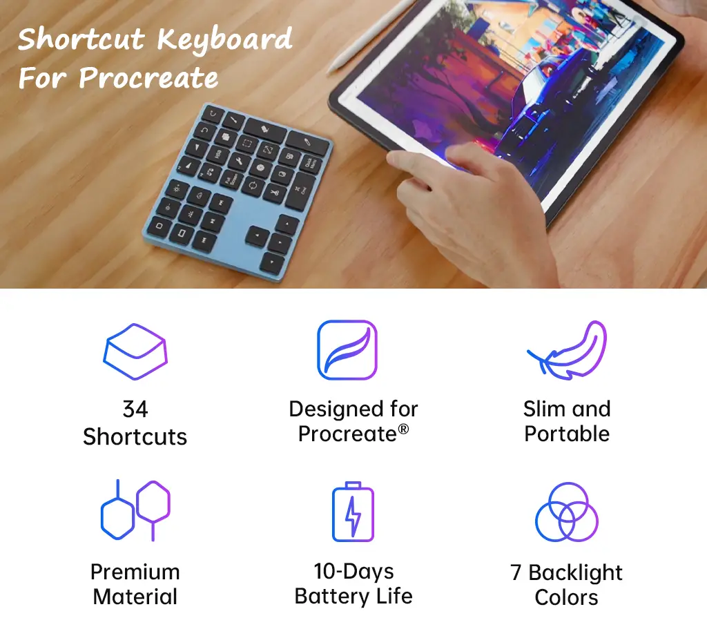 The SKFP, a wireless shortcut keyboard designed to help speed up productivity when using Procreate, is available on Kickstarter. Featuring 34 accessible shortcut keys, 220 hours of working time, 7 color backlighting, and more for a low price, the SKFP looks to be an incredibly useful tool for Procreate Creators. You can check out the Kickstarter here and you can learn more about the SKFP below: