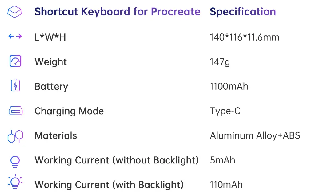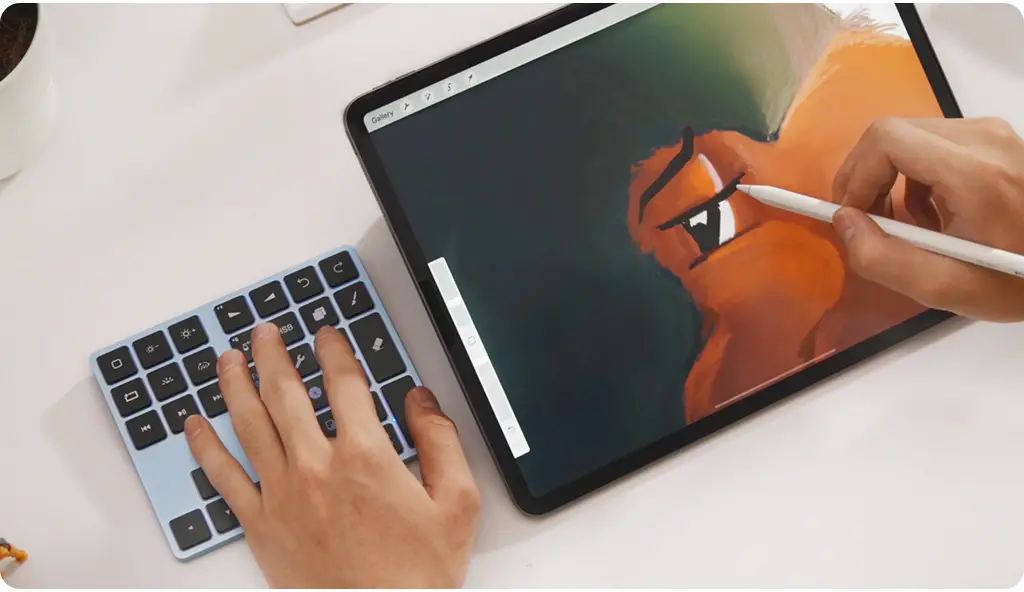 You can select any palettes or tools without using the Apple Pencil®, especially the brush, eraser, and layer buttons on the right side. With this keyboard, you can easily control the size, flow, transparency, and hardness of the brush, drawing with a series of thoughtful shortcuts and making the drawing process more seamless.