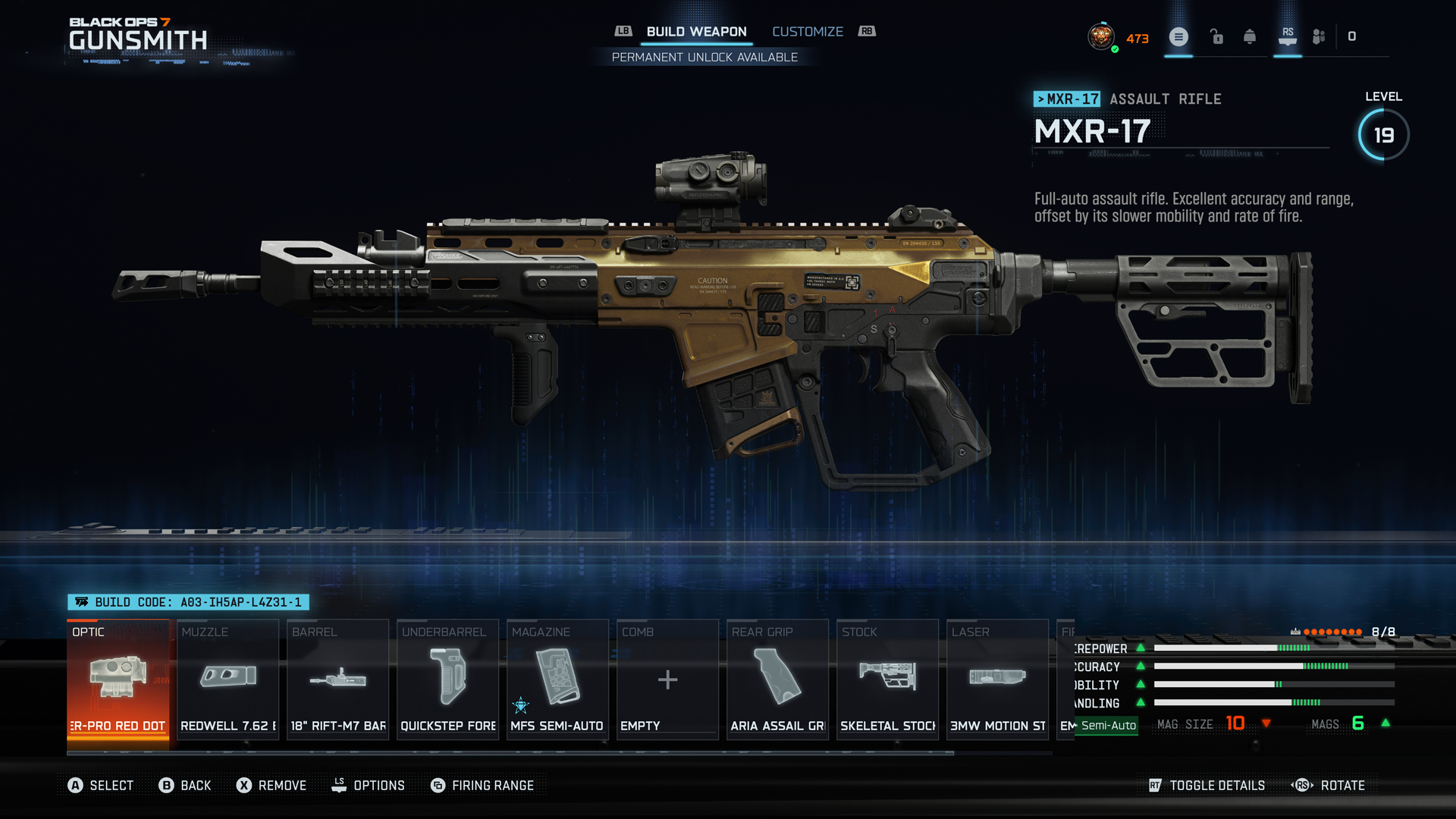 Prestige Attachment: Magazine > MFS Semi-Auto Fast Mag: Converts the MXR-17 into a powerful semi-auto weapon with a unique blend of firepower and handling. Faster to aim and reload with reworked recoil and more damage fall off.