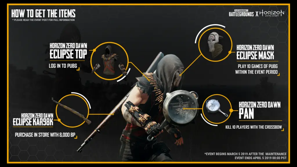 PUBG Corporation and Guerilla Games are teaming up to bring skins from the award-winning Horizon Zero Dawn to the PlayStation 4 version of PLAYERUNKNOWN’S BATTLEGROUNDS (PUBG). From March 5 through April 5, all PlayStation 4 PUBG players can receive free Horizon Zero Dawn content just for logging in, with additional content available by completing in-game challenges or purchasing directly. The full list of new PUBG + Horizon Zero Dawn items include: