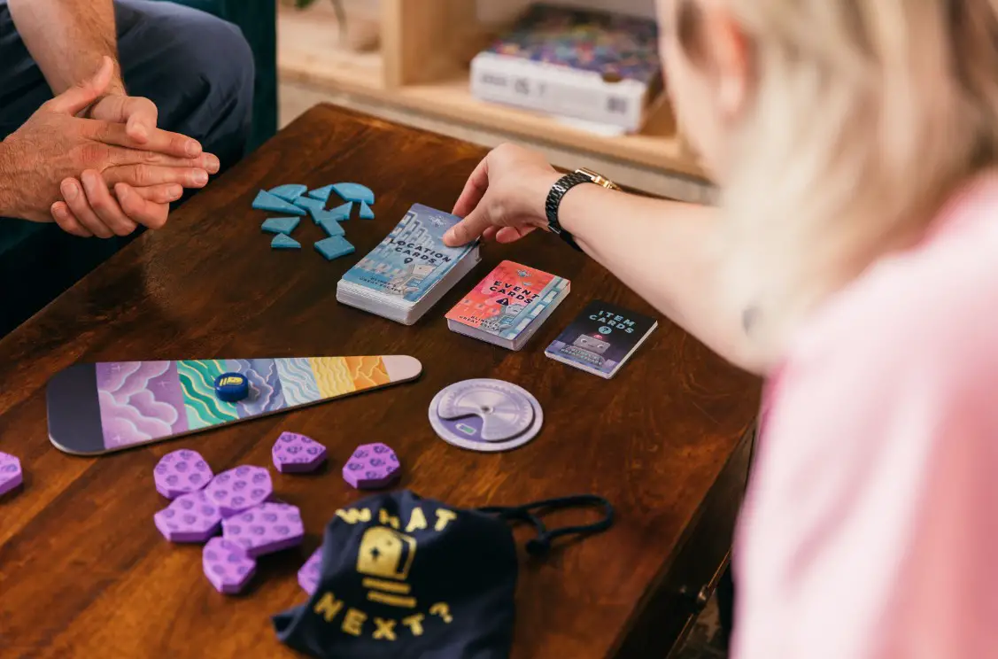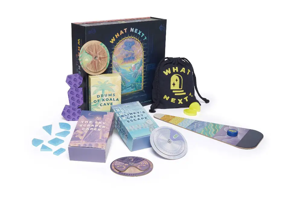 What Next? is the world’s first action-adventure board game from Big Potato (MSRP $50 on Amazon in September)! This cooperative game is the first tabletop game of its kind that adds a fun, physical twist to the “choose-your-own-adventure” concept.