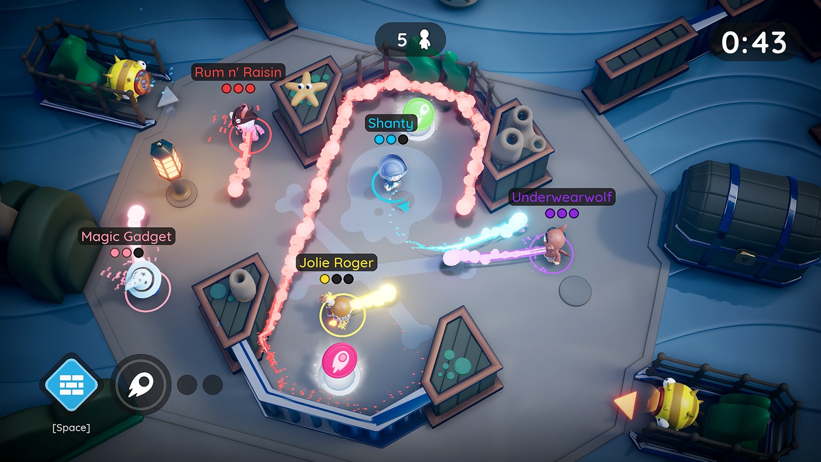 Curve your shots and be the last player standing in Outcasters, an adorably frenetic, fast-paced eight player combat game that tests your speed and creativity. Battle your way across vibrant, colorful vinyl arenas and curve your shots to creatively defeat your opponents. With customizable Outcasters and all sorts of power-ups this is a chaotically fun multiplayer brawler that gives a hook-shot an all new meaning.