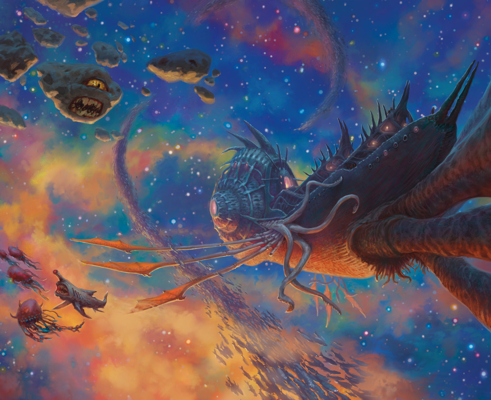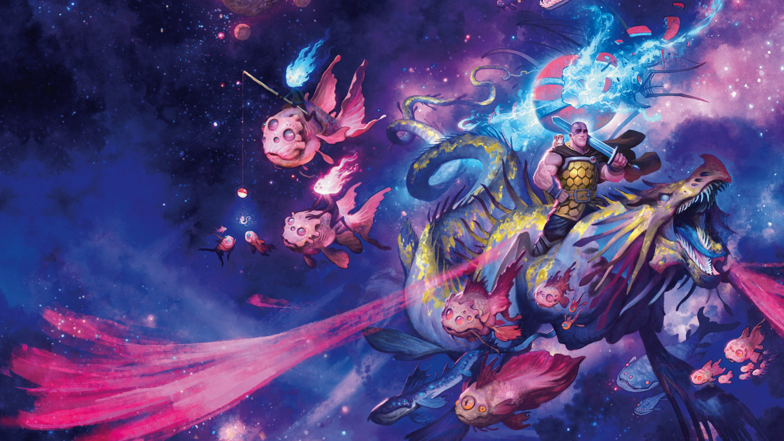 A 64-page hardcover book for Dungeon Masters that presents game statistics and descriptions for over 60 creatures found in Wildspace and the Astral Sea, including astral elves, cosmic horrors, lunar and solar dragons, murder comets, and space clowns.