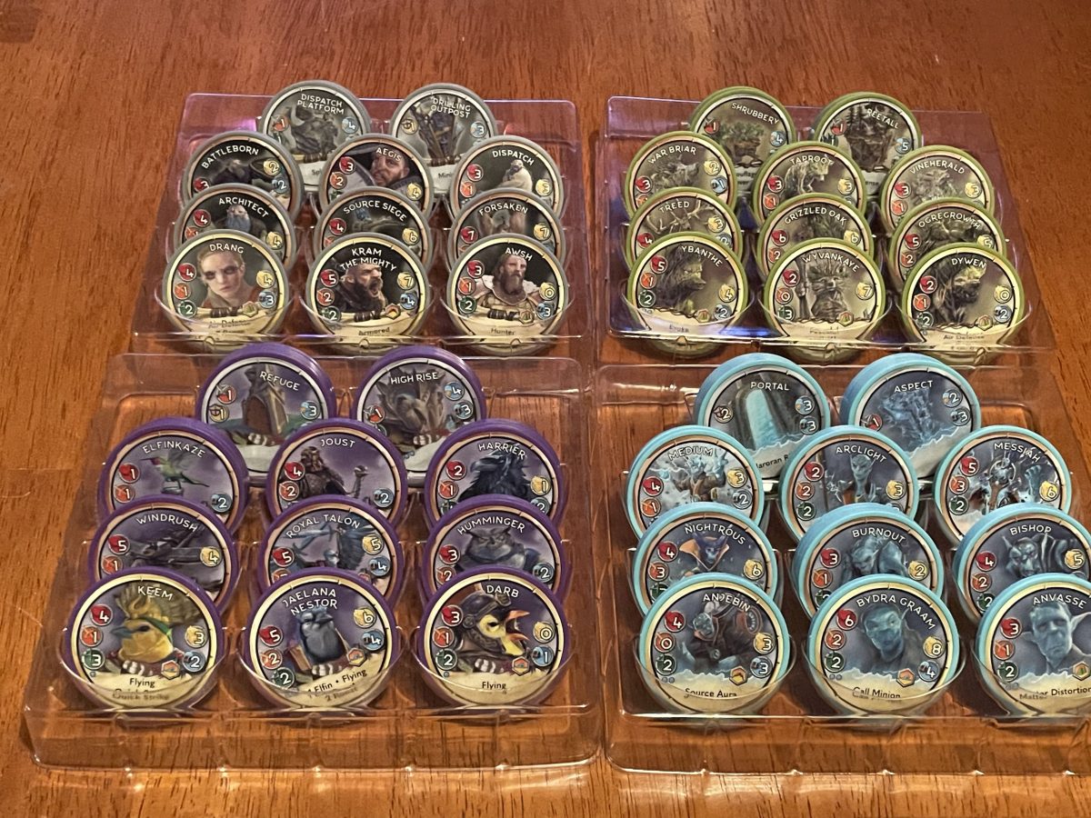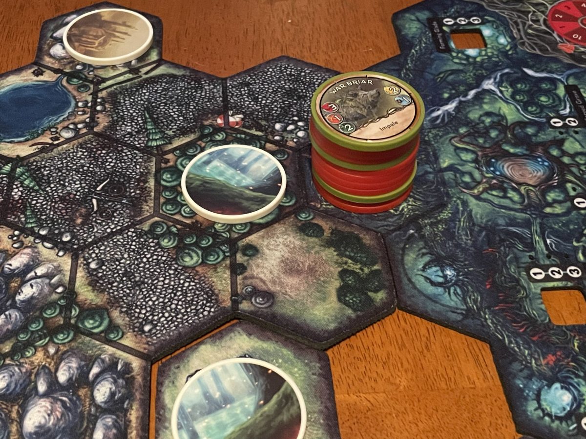 If you’re familiar with other Chip Theory Games products, you know their components are top notch. The neoprene board works well, and the fact they used hexes makes them unique. The chips for the units have a nice heft to them. The artwork on these chips are in full color instead of the monochrome chips of Too Many Bones, making them pop. The stacks of chips really give the game a unique table presence. All the chips have storage trays for putting it into the box, but they’ve also included barracks organizers that can be used to hold your faction’s hero, minion, and spire chips. The health chips are the same quality as the Too Many Bones plastic, so they aren’t as heavy. They work fine, but Chip Theory Games sells upgraded health chips as well. This means that it’s not a cheap game, and you’ll need to get it at a game convention or directly from them through their website.