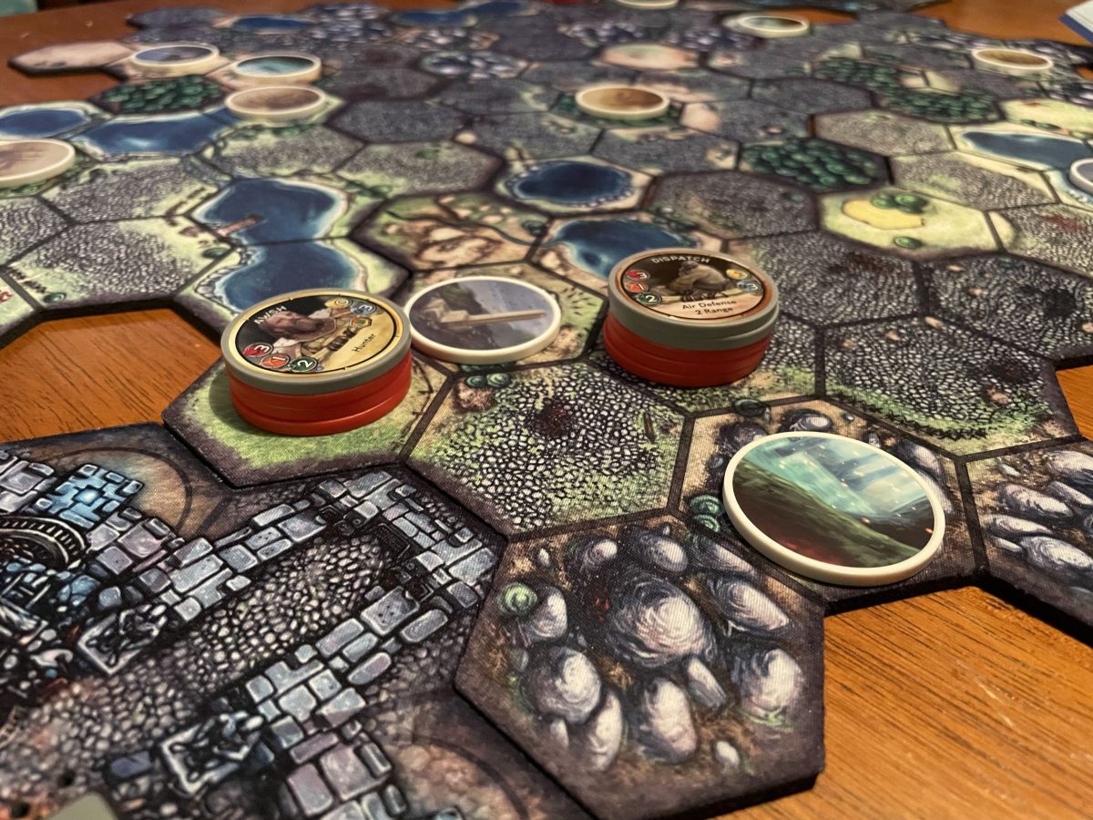After moving units can explore any adjacent landmarks. The player takes a look at the underside of the chip and decides whether to put it face up or face down. Some of these landmarks are hostile and may hinder your units on the board, but defeating the landmark can result in more source for your team. You need to be careful though, as some landmarks have a talent that requires them to be placed face up as soon as they have been explored. This can leave your units open for attack.