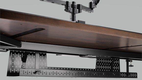 The modular rail system at the back of the desk is ideal for mounting meeting or streaming gear such as cameras, lights, and microphones, and utilizes a universal standard aluminum T-Channel crossbar for compatibility with hundreds of aftermarket attachments and accessories. Because multi-monitor setups are so commonplace nowadays, every Platform:6 features dual monitor arms as a standard inclusion, attaching to the rail for mounting up to two 32” monitors (or a single ultrawide 34”).