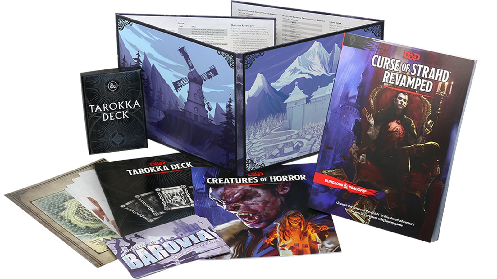 - Curse of Strahd, one of the most popular Dungeons & Dragons roleplaying game products of all time, split into three parts: a 224-page perfect-bound adventure for characters of levels 1–10, a 20-page Creatures of Horror booklet of new monsters that appear in the adventure, and an 8-page Tarokka Deck booklet.