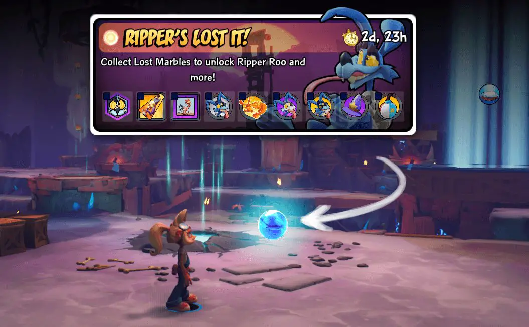 I say “first debut” because Heroes (and Powers) in Crash Team Rumble will debut in two phases: 1) Early Access and 2) Full Release. On July 6th, a new Event will appear on the game’s main screen called “Ripper’s Lost It!”. Lost what? Well, his marbles of course! During this weeklong event, if you can find and collect the in-world marbles scattered across the maps, you will earn exclusive rewards themed and tailored for Ripper Roo. If you collect enough marbles, you will unlock Early Access to Ripper Roo and you’ll be able to play as him from here on out! (And if you go above and beyond, you can unlock unique challenges and skins for Ripper – including my personal favorite, the “Professor” skin!)
