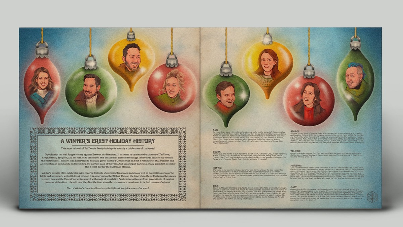 Hear ye, hear ye! Winter’s Crest is upon us! To celebrate this festive occasion, Critical Role today announced the release of Critical Role Presents: Winter’s Crest (A Holiday Album), their third album under the Scanlan Shorthalt Music label. This 11-track collection, honoring the beloved Tal’dorei holiday, is now available for digital streaming and purchase on all major platforms, with pre-orders open for both standard and deluxe vinyl editions (set to ship in Spring 2025). The deluxe vinyl edition comes signed by the cast of Critical Role and contains extras: a variant cover, a postcard, a vinyl sticker pack of cast member portraits framed in ornaments, and a pack of festive polaroid-style photos.