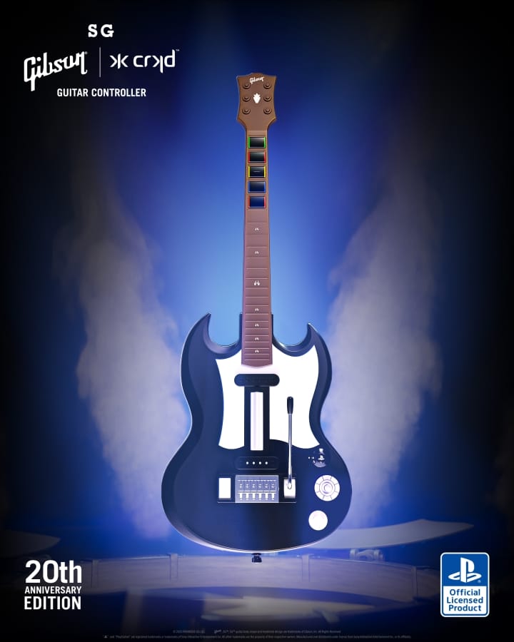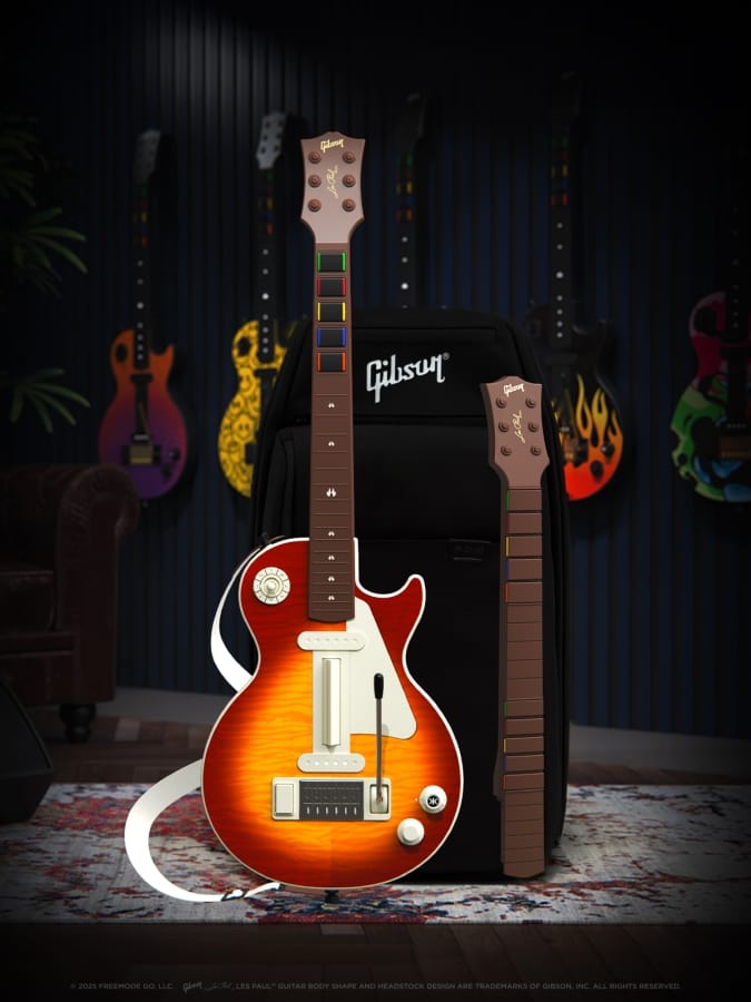 The Guitar Controller features both a Brown Signature Les Paul OG Pro Fret Neck and a Brown Signature Les Paul Solo Pro Fret Neck, in addition to a Gibson x CRKD custom shoulder strap with off-white fabric and co-branded brown leather ends, two exclusive collector pins, a wireless dongle, a classic sticker sheet, an 8.5ft USB-C charging cable, and a rechargeable battery. All the collectibles are housed within a custom-made CRKD x Gibson Guitar Controller Backpack, featuring dedicated compartments for two fret necks, a secure body compartment, and additional storage.