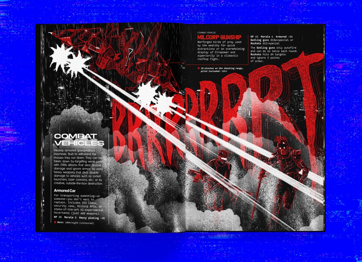 Similar to the apocalyptic prophecies in MÖRK BORG, a campaign-defining countdown mechanic will dramatically affect and shape the game world regardless of the players’ actions. In CY_BORG, this comes in the shape of Miserable Headlines; catastrophes and events reported by the corp-owned news feeds with varying regularity until the cataclysmic conclusion seven headlines in. Nothing is ever static. The city is a living—or rather, dying—place.