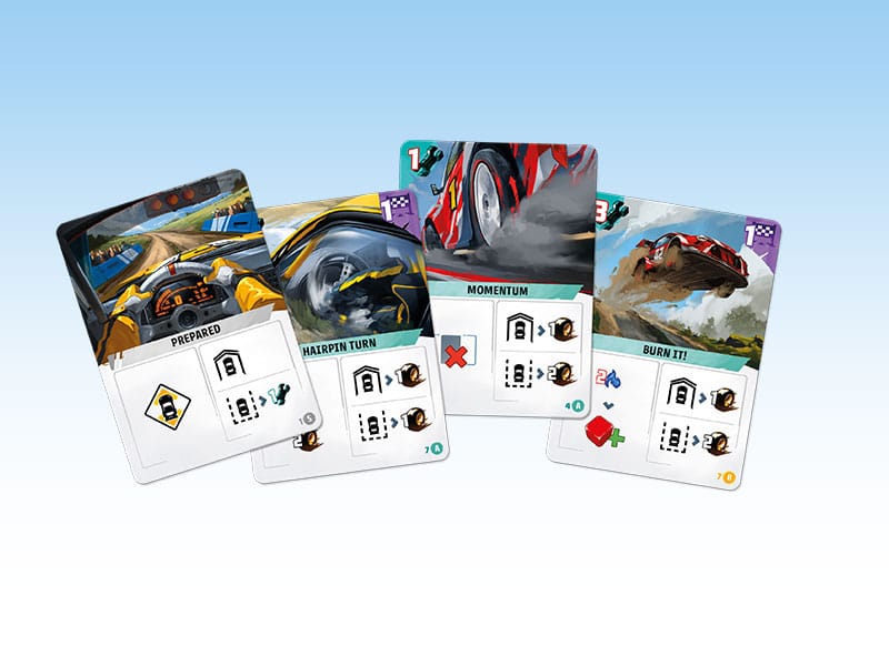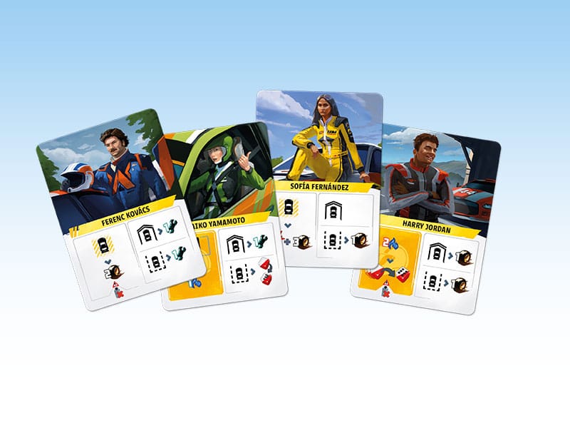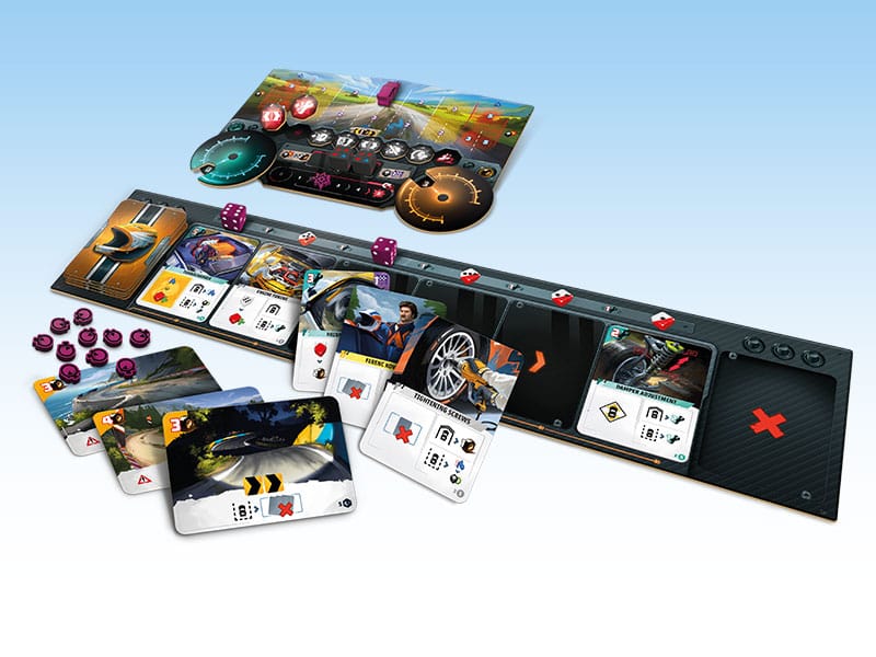 Players (1 to 4) start with a basic action deck and a unique pilot, then acquire more cards throughout the game to tune their vehicle and improve performance as they manage suspension settings, adjust tire pressure, tweak the differential, and so forth... Actions are activated based on which dice slot they are linked to, and driving style choices - fast or cautious - further impact the effects of each card. Each choice matters as pilots push the limits, balancing precision and risk in pursuit of victory.