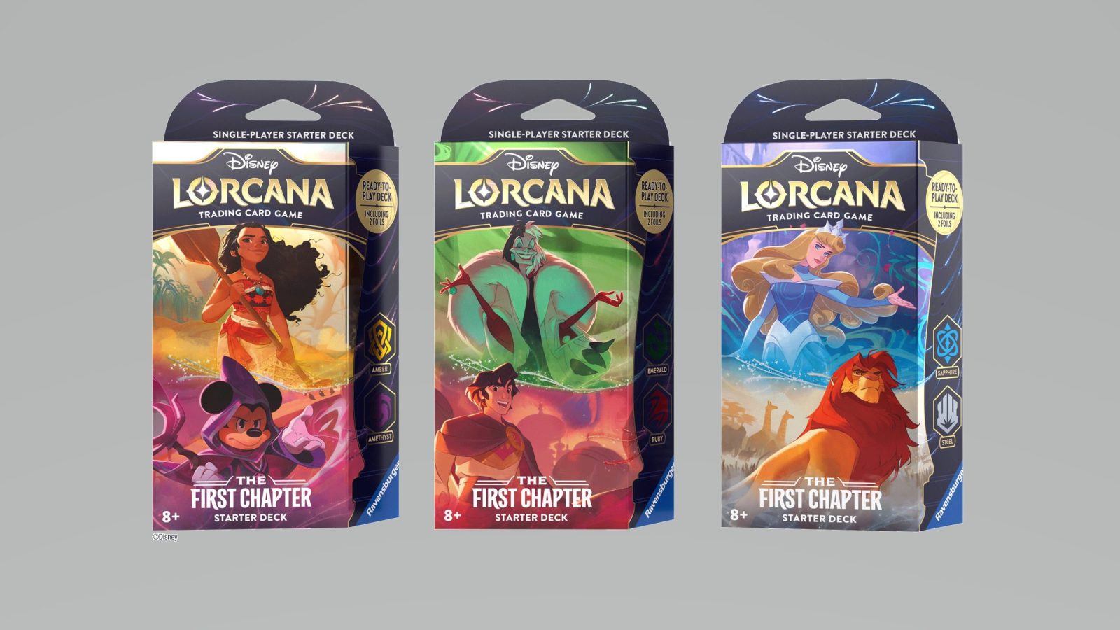 Starter decks will provide a balanced and ready-to-play game deck. Players will be able to choose from three different options that each include a specific list of 60 cards in two of the six “inks” — Amber and Amethyst, Emerald and Ruby, or Steel and Sapphire. Starter decks will also include one booster pack and game tokens. A booster pack will contain 12 randomized game cards, including one foil card and two cards with rarities of rare, super rare, or legendary.