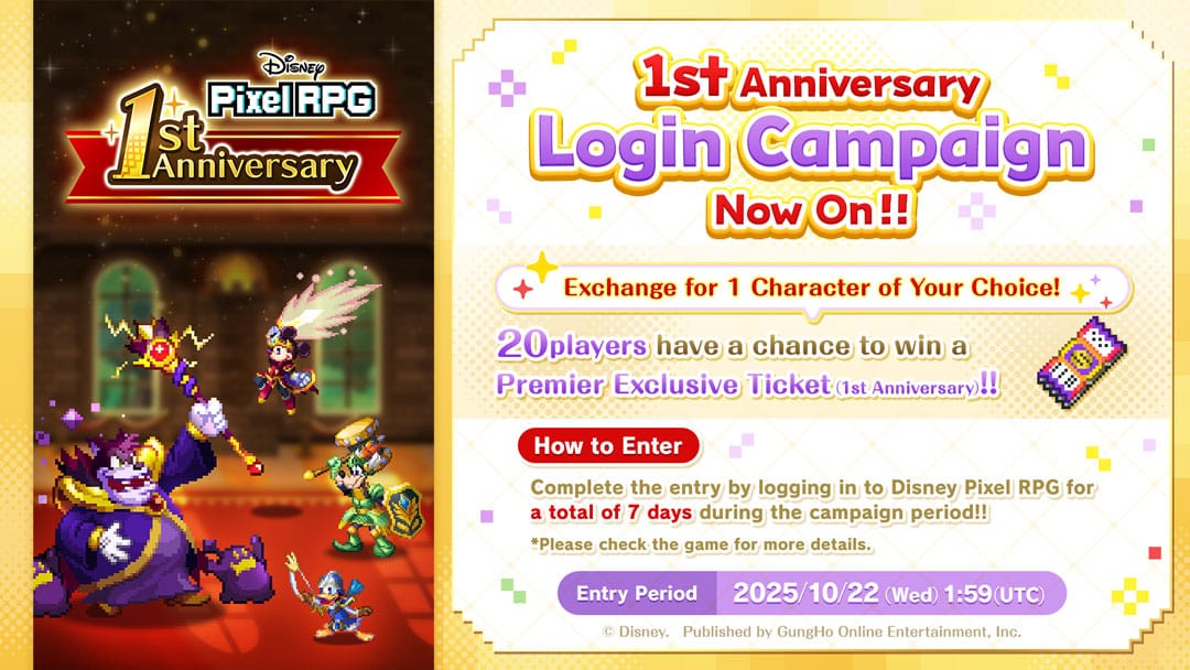 Today, GungHo Online Entertainment, Inc. is announcing the celebration of the first anniversary of "Disney Pixel RPG" on October 7, 2025, the mobile RPG for iOS and Android™ devices.