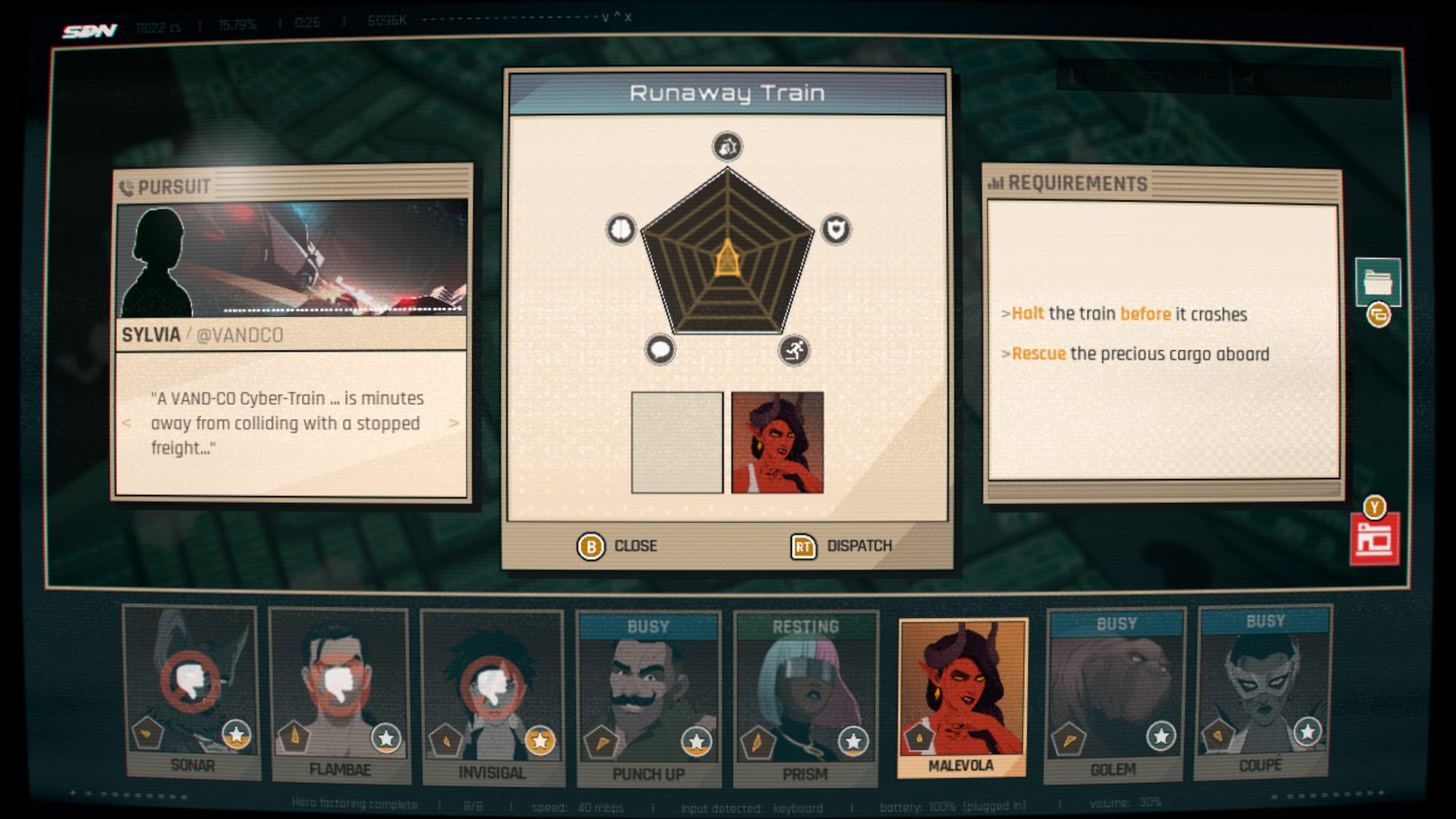 Dispatch is a superhero workplace comedy that puts players in the shoes of Robert Robertson, better known as Mecha Man, whose mech-suit was destroyed in a battle. The former superhero is now in charge of a rehabilitation program for ex-supervillains and must manage a dysfunctional team of misfit heroes. Robert’s task is to dispatch this chaotic crew on missions, navigate their quirks, flaws, and personal baggage, all while trying to repair his suit and get revenge against his arch-nemesis.