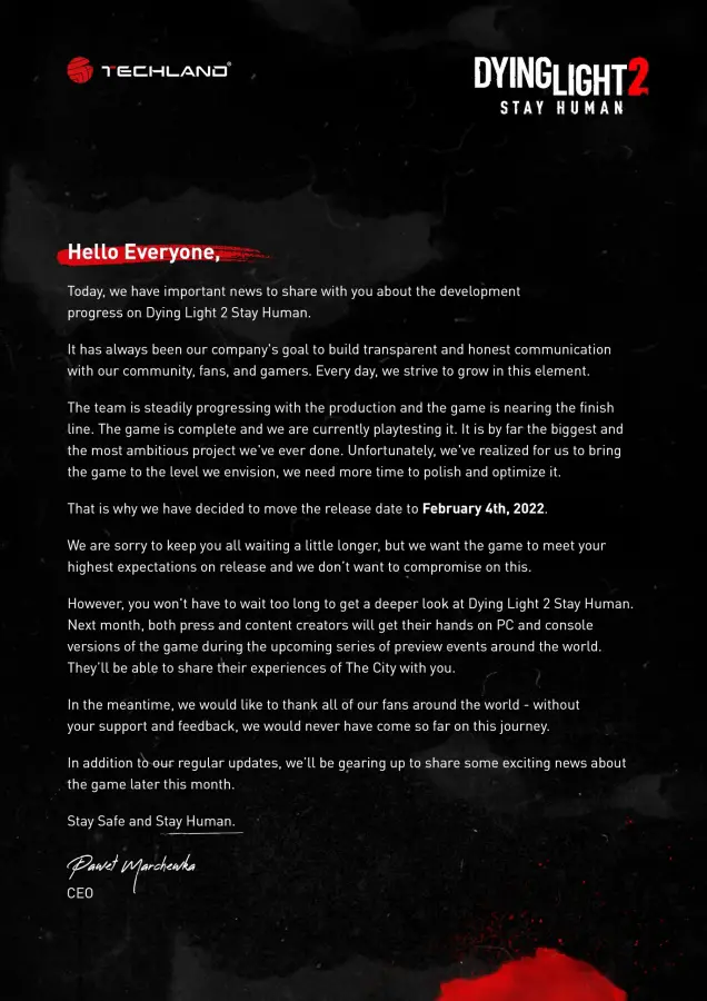 Techland released a statement today explaining that Dying Light 2 Stay Human has been delayed to February 4th, 2022, so the team can deliver the best possible product. While it is always unfortunate to see a release delayed, I’d much rather have a polished game than one rushed out too early. You can view the official statement below:
