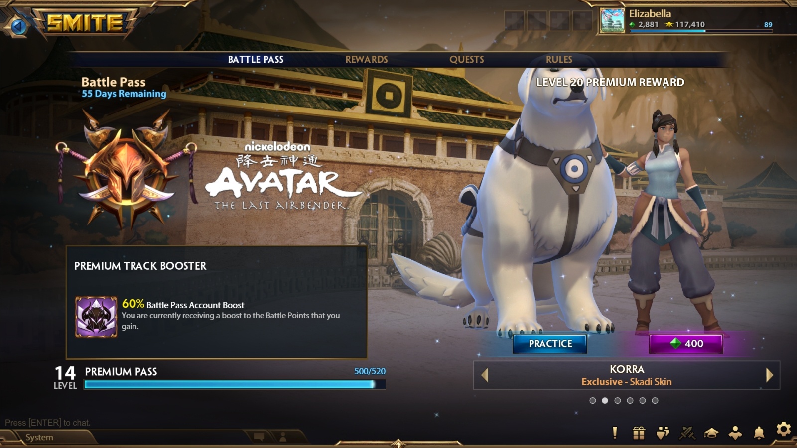 The slippery mage Merlin was turned into Aang, Susano is Suko, and Skadi with her loyal companion Kaldr have been transformed into Korra and Naga. Each character has two versions of their skin, though the second versions can only be obtained in the Prestige path after completing the 60 Premium levels. The battle pass costs 750 Smite Gems, and you have 56 days to complete it.