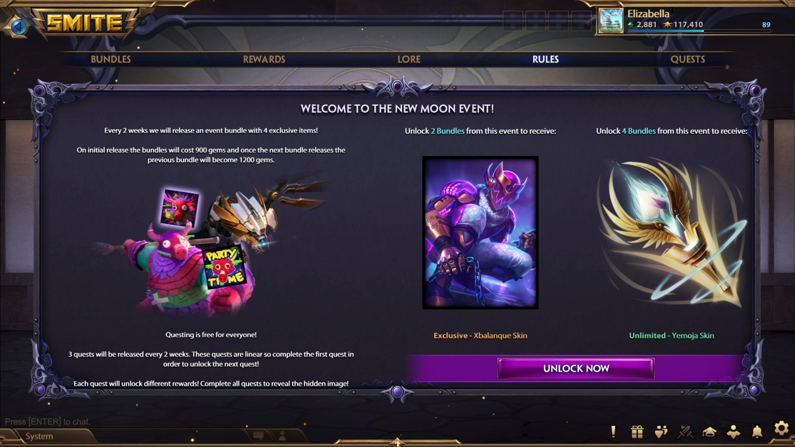 Unlocking two bundles in the New Moon event will get you a new Xbalanque skin, and the final reward will be an Unlimited Yemoja skin.