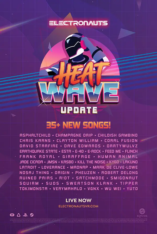 VR music creation title Electronauts received over 35 new tracks today as part of the Heatwave Update. These include tracks from Childish Gambino, Giraffage, JMSN, Kygo, and TOKiMONSTA.