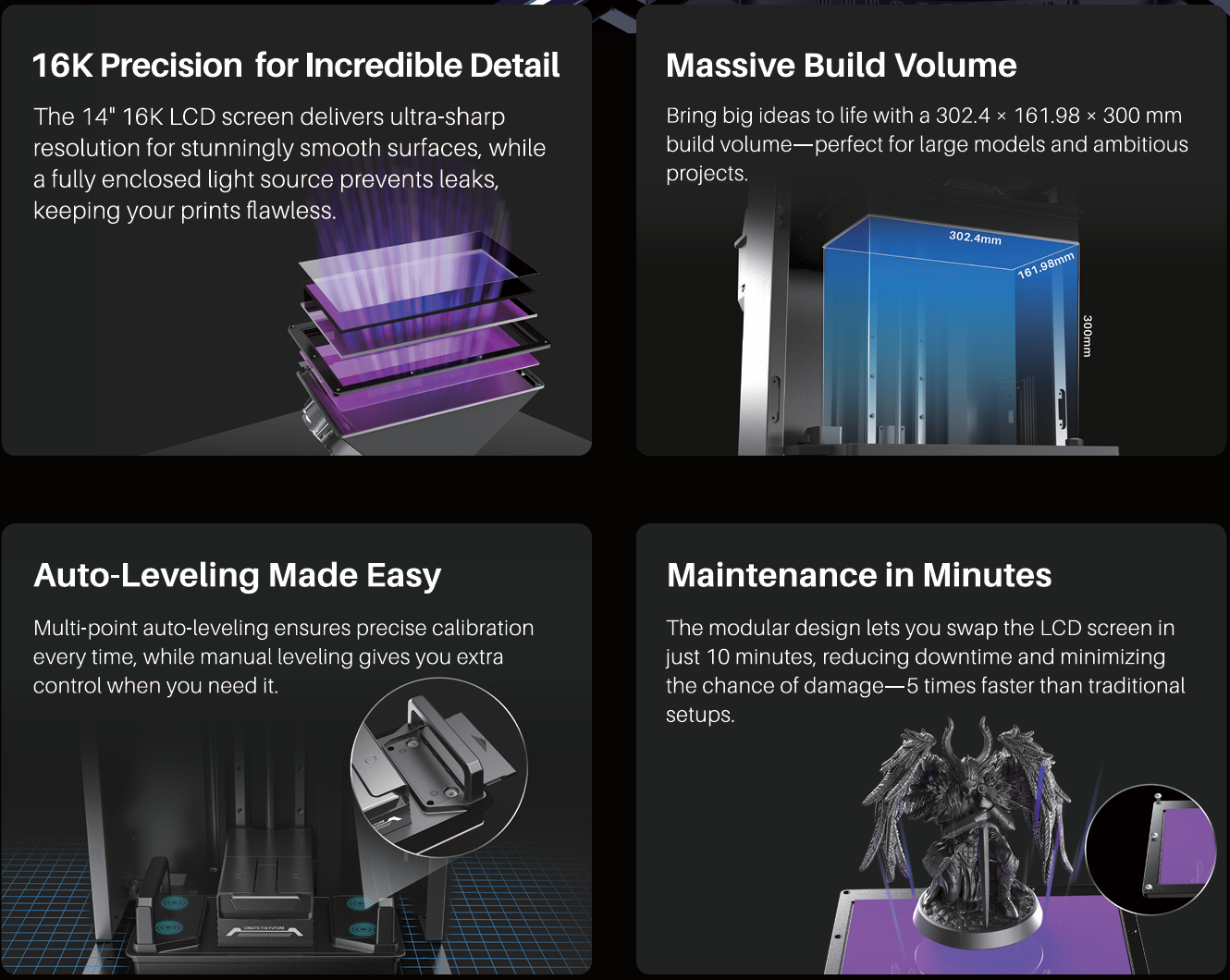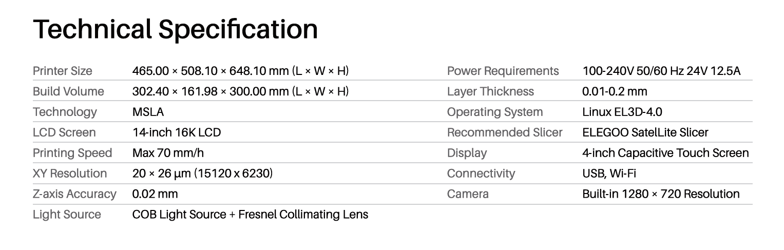 The Jupiter 2 features an expansive build volume of 302.40 x 161.98 x 300.00 mm, the largest in the Jupiter series, ideal for large-scale projects. It raises the bar with a 14-inch 16K LCD screen, achieving the series’ highest 20×26µm XY resolution for razor-sharp details and ultra-smooth surfaces. A fully enclosed light source ensures flawless prints, while multi-point auto-leveling guarantees precise calibration with minimal effort. For advanced users, a manual leveling option offers additional control.