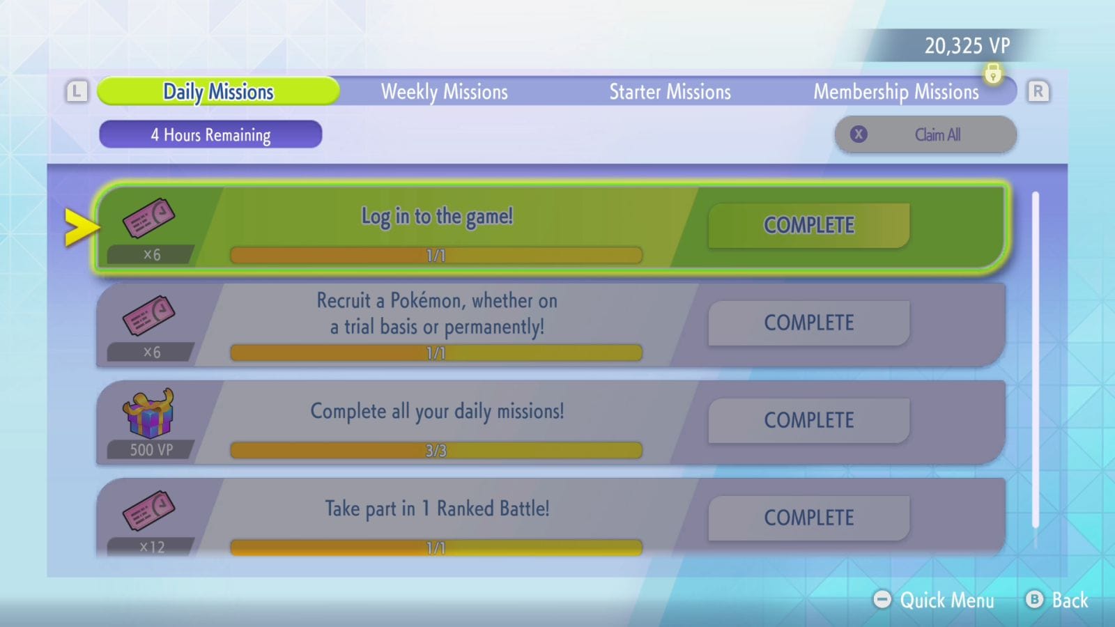 Missions are divided by Daily Missions, Weekly Missions, Starter Missions, and Membership Missions. Completing them is straightforward, and they'll reward you with various prizes.