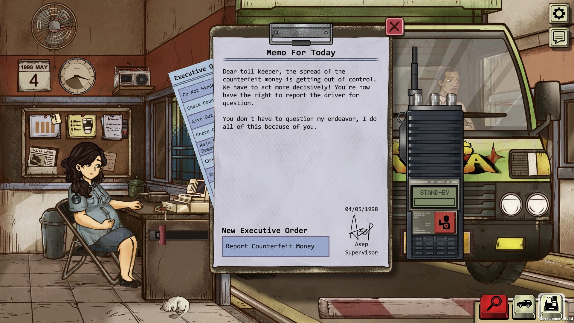 1998: The Toll Keeper Story follows Dewi, a pregnant toll booth worker struggling to protect her family while navigating fear, unrest, and scarcity in the fictional nation of Janapa. The game combines choice-driven storytelling with tense “Papers-Please”-style mechanics, challenging players to balance morality, survival, and duty. Each day at the toll booth presents new dilemmas, and each choice ripples into Dewi’s home life, family safety, and the lives of strangers passing through.