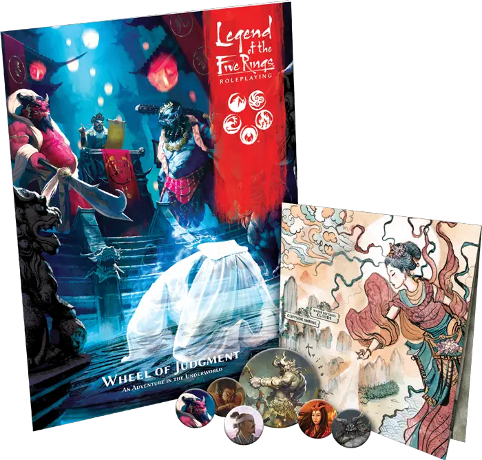 Like previous Legend of the Five Rings Roleplaying adventures, Wheel of Judgment is a complete 32-page booklet, that also comes with a full double-sided map and more than 50 punchboard tokens that help you bring your journeys to life and easily convey the location of every player and enemy.