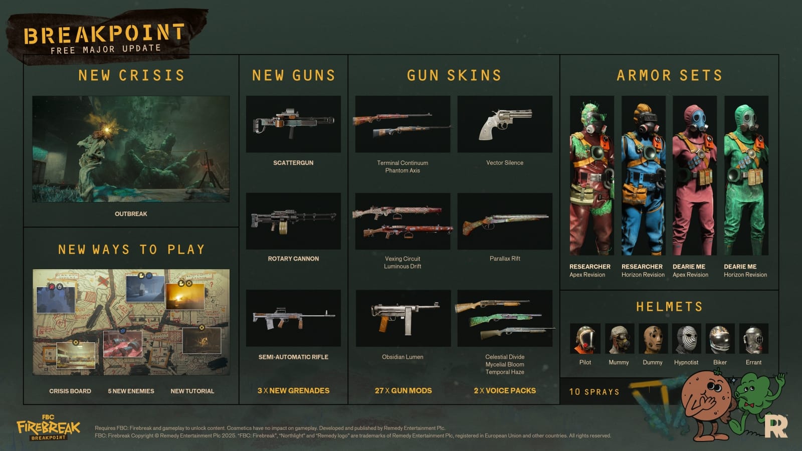 New Content - Outbreak - A brand-new Crisis (formerly Job), which is set in the Research sector of the Oldest House. Firebreakers must research and contain a dangerous mold cluster, while battling new enemies. The update also adds three new guns, grenades, cosmetics and much more.