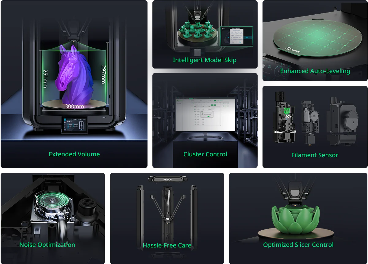- Extra-Large Print Volume: 300✖297mm³ (Max cylinder height: 251mm), allowing for large, complex models to be printed in a single pass—minimizing seams and assembly time.