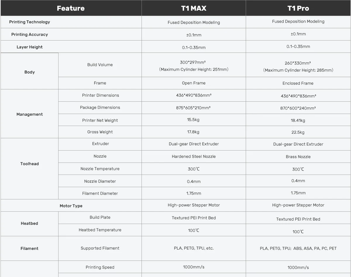 There is a T1 Max and T1 Pro printer model, and it's worth putting them side-by-side to showcase the differences. We've got a spec sheet that showcases those differences so you can evaluate which is the right one for you, and also showcase the generational differences between them. Observe: