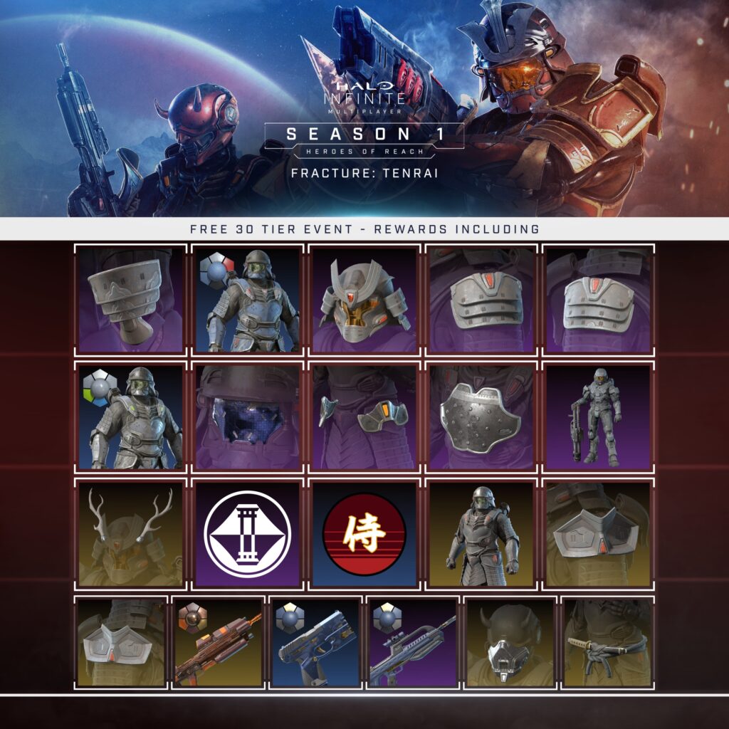 As a quick refresher: Fractures are a completely free limited-time event that returns multiple times over the course of a Season. The free Event Pass offers unique cosmetics and rewards over 30 tiers, with Tenrai being themed around the Yoroi Armor Core – a Samurai-themed Spartan. These rewards are earned by playing in the action-packed Fiesta event playlist and completing event-specific Challenges.