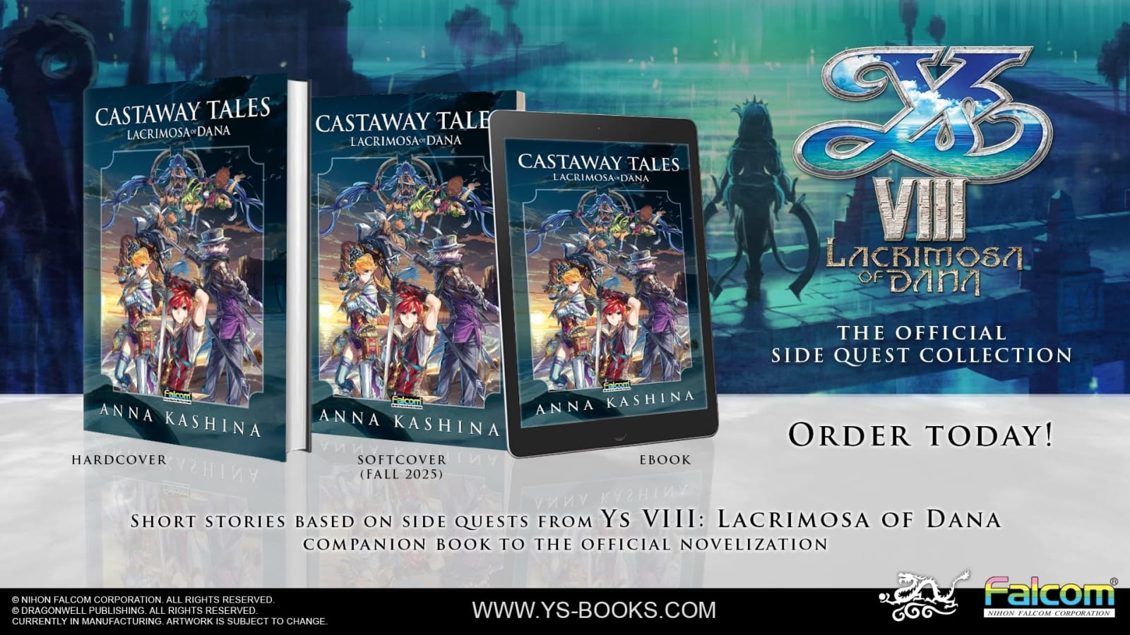 Dragonwell Publishing and Nihon Falcom are further expanding the story of Ys VIII: Lacrimosa of Dana with three new releases. First is an audiobook version of the novelization written by Anna Kashina, second is Lacrimosa of Dana: Castaway Tales, a short story collection based on the game's side quests. Finally, Lacrimosa of Dana: Castaway Cookbook is a collection of recipes from the game written from the perspective of the characters. You can preorder each individually, or spring for the collector's set including all three books plus a few extra goodies.