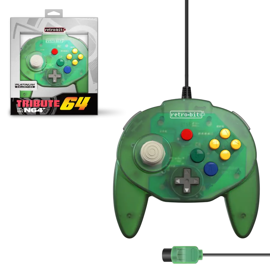 Retro-Bit®’s Tribute64 controller features a wide and ergonomic design. The thick and reshaped dual Z shoulder pads provide maximum grip, while the repositioned D-pad grants dual thumb access. It also encompasses features that include a memory card port and rumble pak and a larger start button.