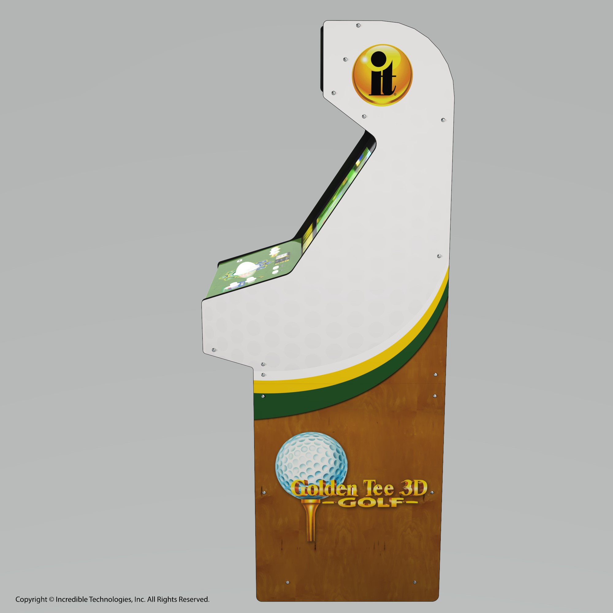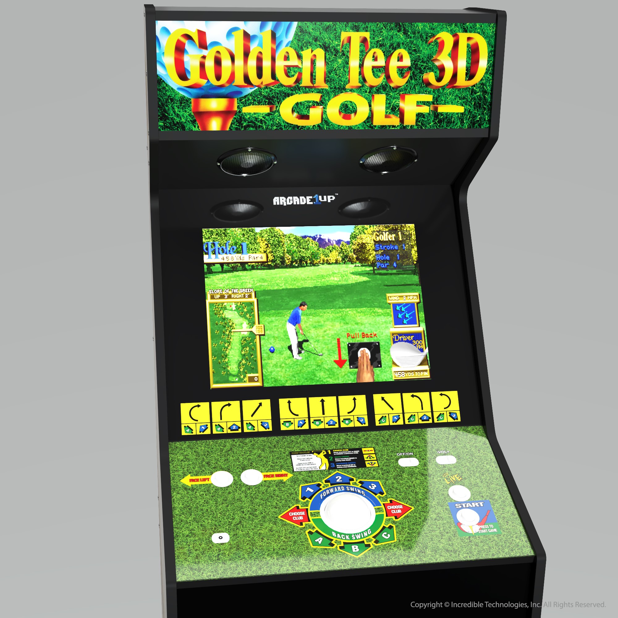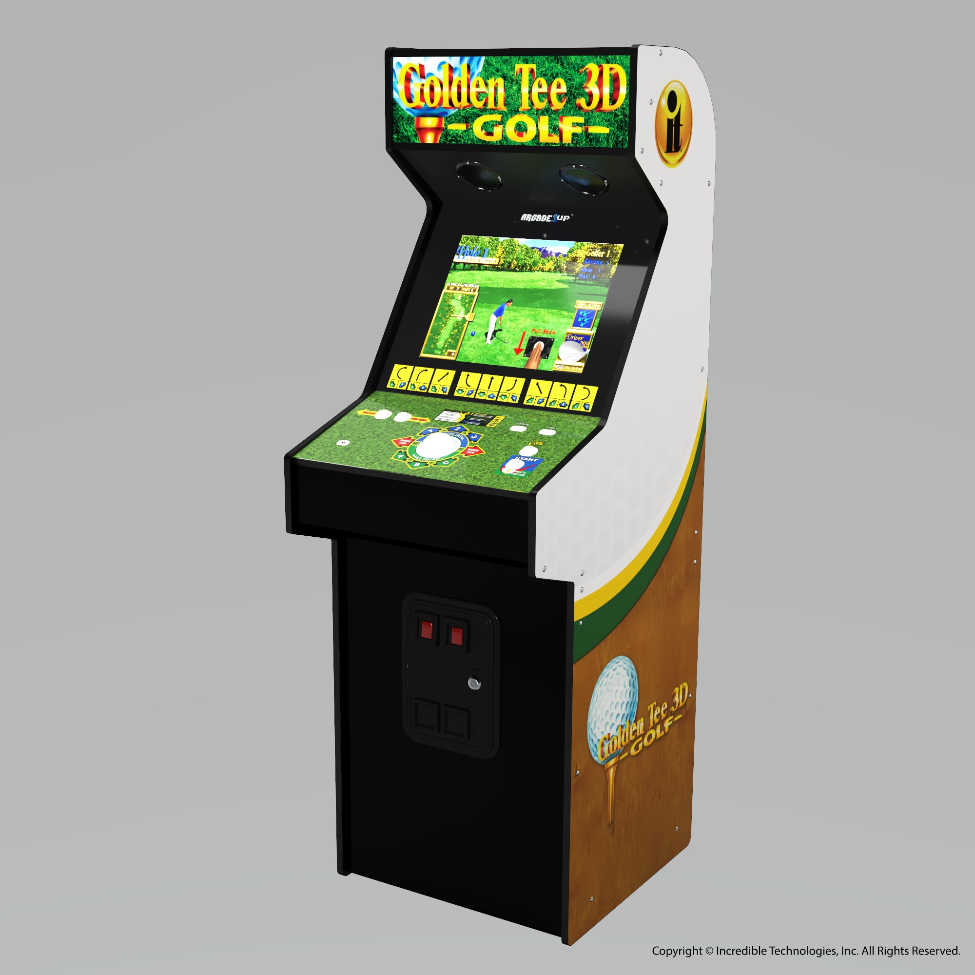Standing at an impressive 66” tall, Arcade1Up’s Golden Tee 3D home arcade machine includes: