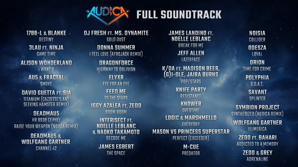With an expansive soundtrack that features tracks from household names, up-and-comers, and Harmonix originals, AUDICA maintains Harmonix’s reputation for delivering genre-defining soundtracks.