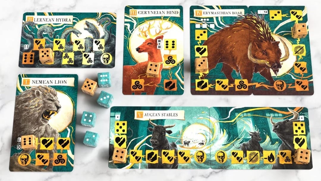 Engage in epic battles as you roll and allocate dice to unleash powerful abilities against fearsome foes, including the multi-headed Lernean Hydra, the flesh-eating Stymphalian Birds, and the formidable three-headed Cerberus. Each triumph earns you mighty rewards like the Impenetrable Hide or Athena’s Rattle, granting the strength needed to face the ever greater trials ahead.