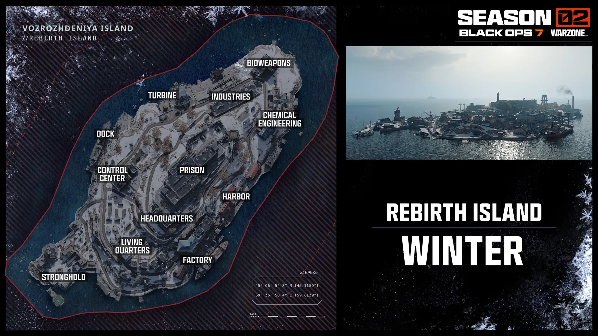 Rebirth Island Winter Refresh: Season 02 opens on a snow-covered Rebirth Island now under Guild control. New structures, including the Turbine point of interest, along with terrain and layout changes tied to expanded faction operations, reshape familiar routes and introduce new areas of focused combat across the island.