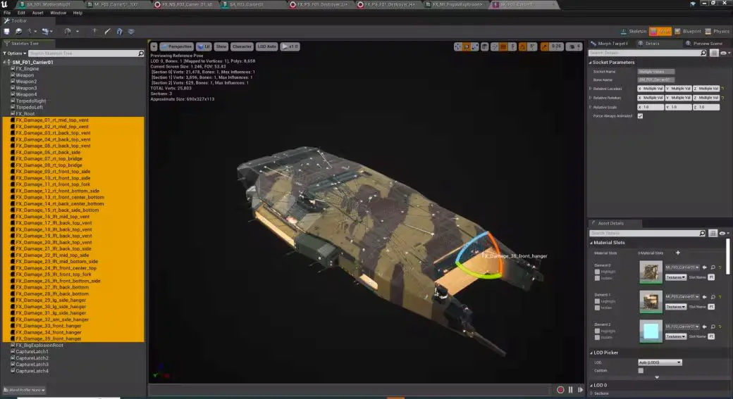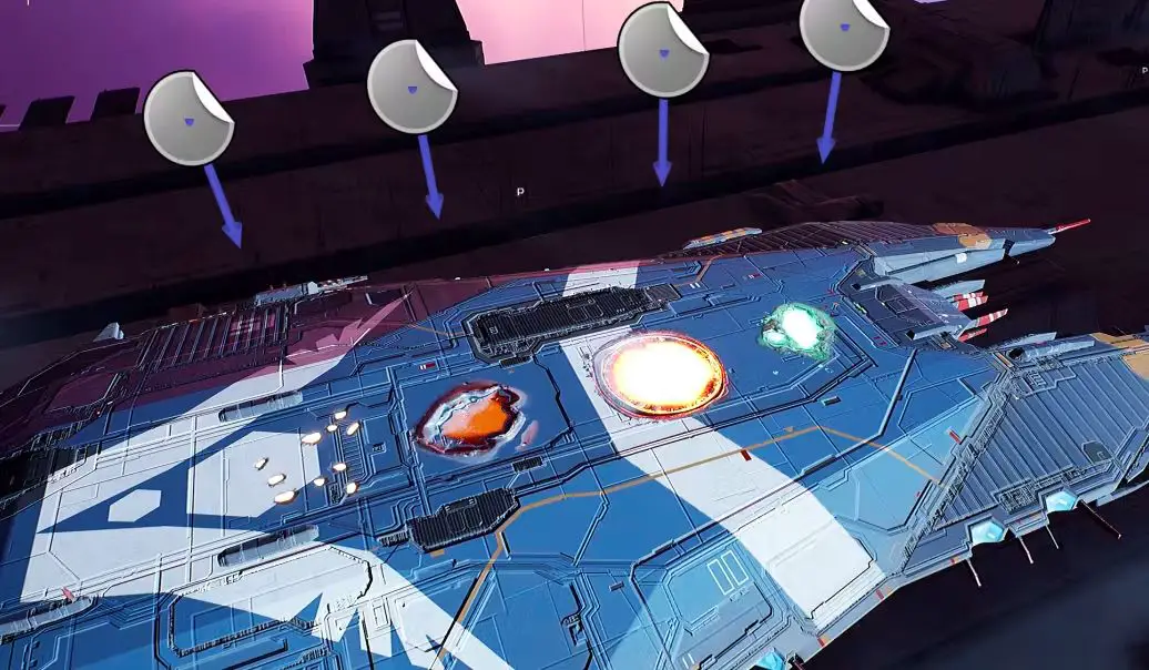 For larger ships, we use a series of “damage sockets” placed around the hull where we can spawn required FX to help simulate damage. We also have a range of damage stages we call light, heavy, critical, and “it was a pleasure serving with you, Captain”.
