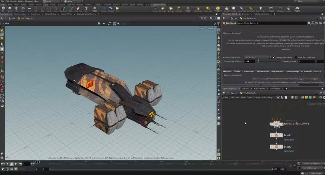 Thanks to the hard work of Adrian “Ed” Lee, Francisco Múrias, Liam Smyth, and many others, we developed a procedural “Ship Breaking” tool leveraging the power of a great piece of software called Houdini. This tool realistically simulates the different ways a ship hull will collapse under the immense pressure of an explosion. But that’s just the beginning. This tool also models the internal rooms and mechanisms of a given ship, and then warps and crinkles them so they bulge realistically — just like what would happen if an explosion from within a ship forced all its guts out into space.