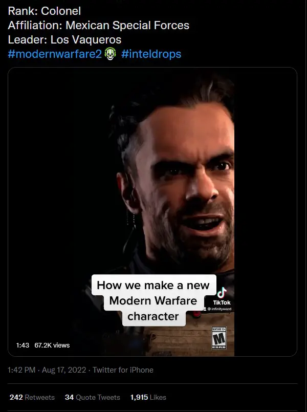 A second intel drop for the upcoming Modern Warfare just released and introduces players to a new character, Colonel Alajandro Vargas, leader of the Mexican Special Forces. Intel drops like this will be releasing regularly on all of Infinity Ward’s social media pages, so be sure to follow them on your platform of your choice. You can click below to check out the intel drop and here’s links to Infinity Ward’s social media sites: Twitter, Facebook, Instagram, TikTok.