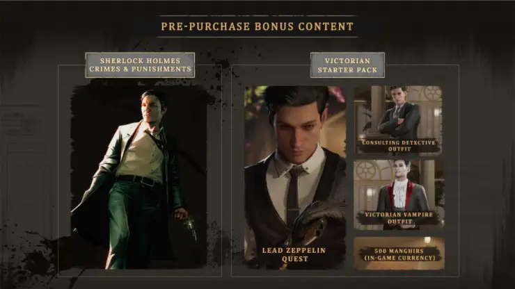 All preorders will receive the Victorian Starter Pack which includes a special quest titled “The Lead Zeppelin”, a unique Consulting Detective and The Victorian Vampire in-game outfits, 500 Manghirs (the currency of Cordona Island) which players use for various cosmetic customization as well as a free digital copy of Sherlock Holmes Crimes and Punishments on the same platform they ordered Chapter One on.